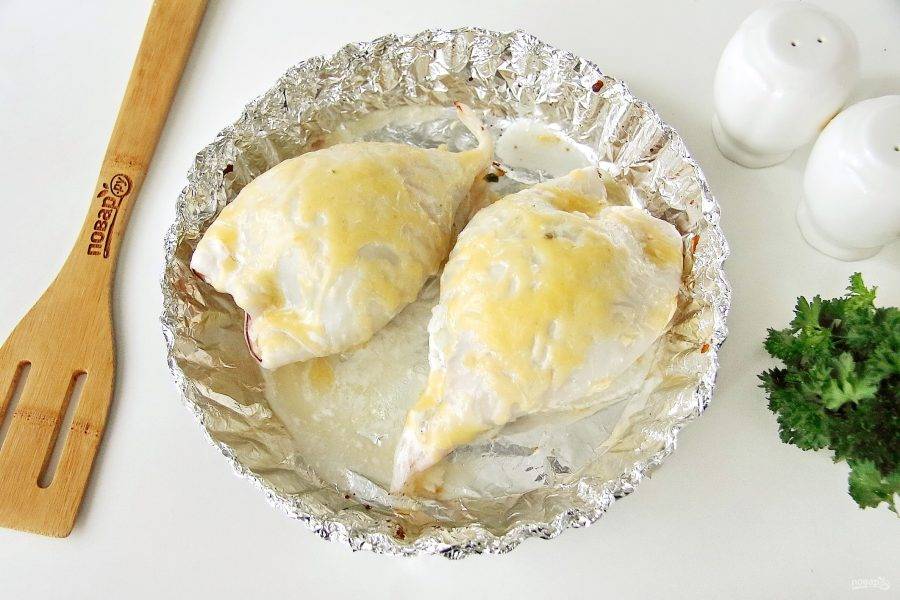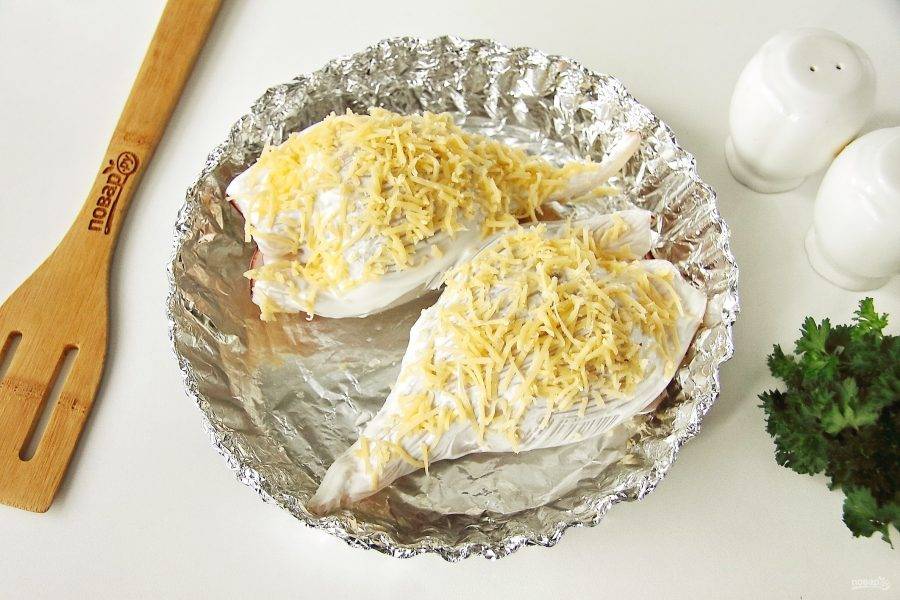Переложите кальмаров в смазанную маслом форму для запекания, я застилаю ее предварительно фольгой, смажьте верх сметаной и посыпьте остатками сыра.