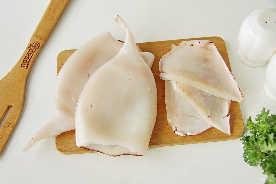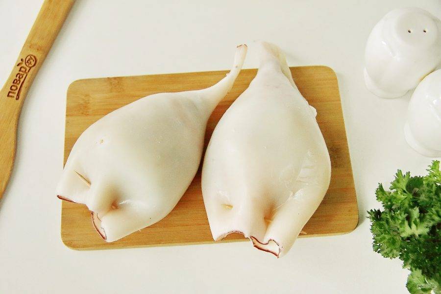 Снимите у кальмаров пленку, удалите внутренности и хорду, после чего промойте их под проточной водой. Срежьте аккуратно плавники.