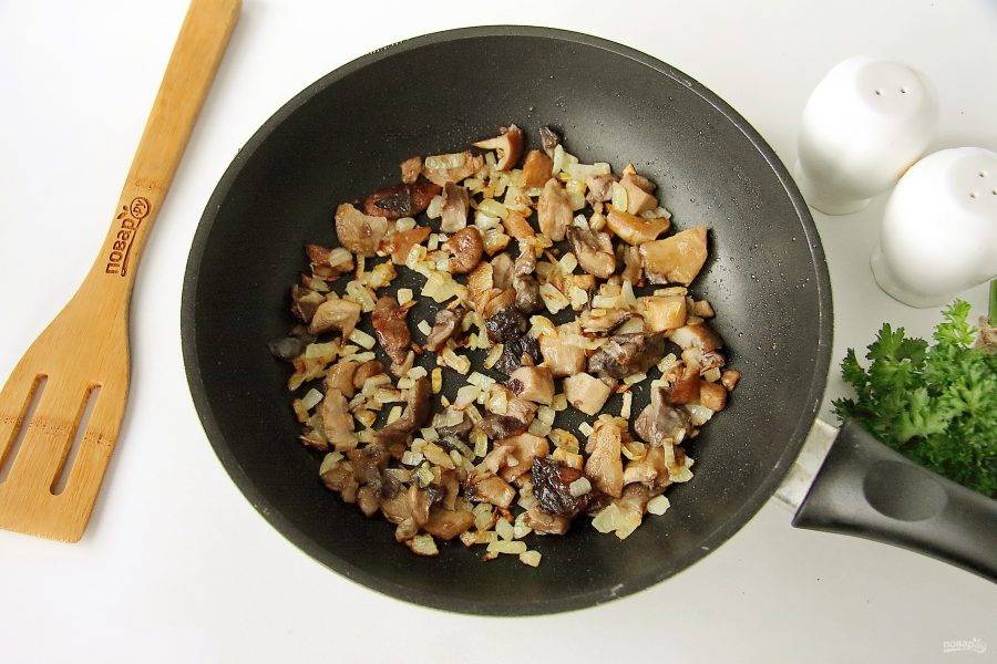 Добавьте грибы и обжарьте все вместе до полной готовности. Грибы можно взять любые, причем подойдут как свежие, так и замороженные.