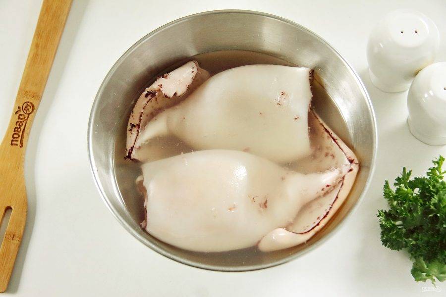 Размороженные тушки кальмаров залейте кипятком на одну минуту, затем воду слейте, а кальмаров опустите сразу же в ледяную воду.