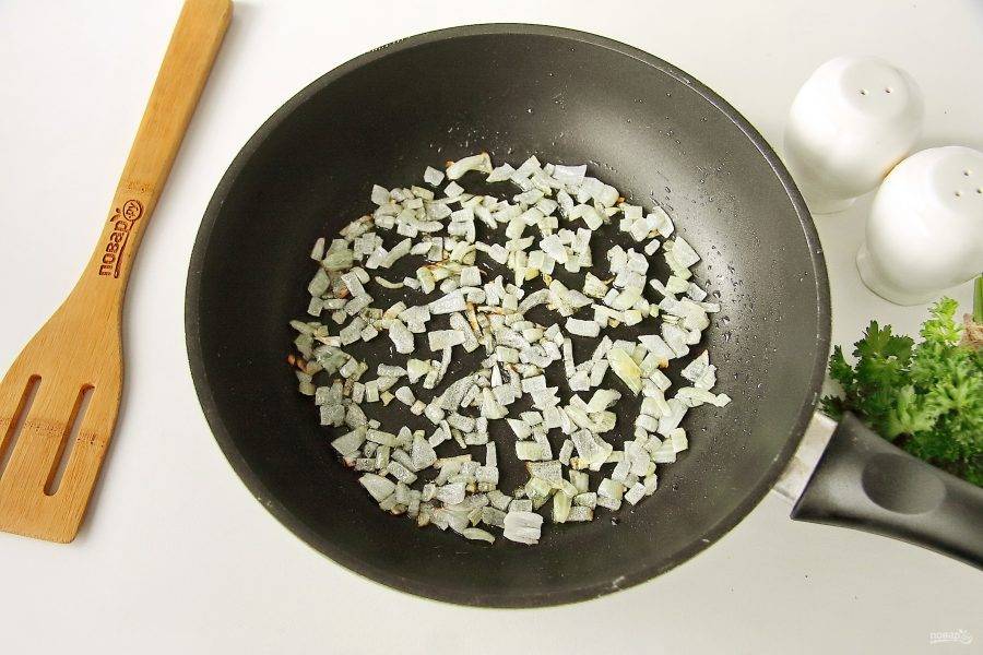 На сковороде разогрейте масло и обжарьте до мягкости нарезанный кубиками лук.