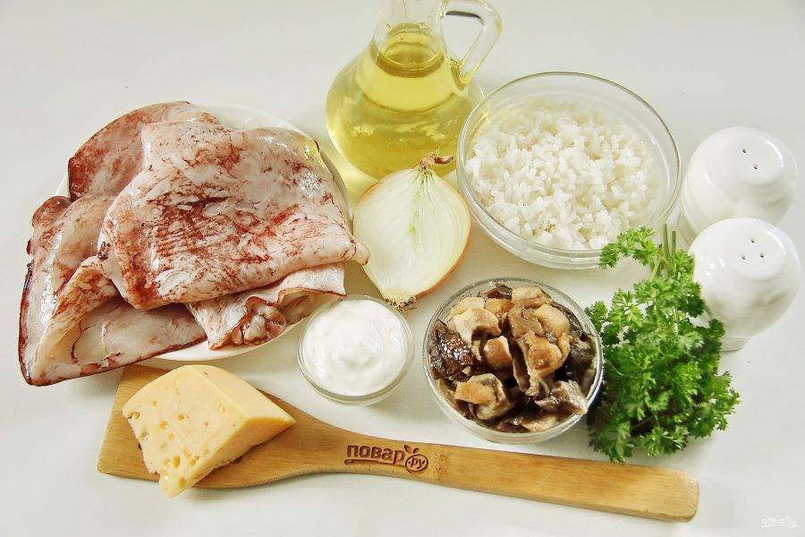 Подготовьте все ингредиенты. Рис заранее отварите в подсоленной воде и откиньте на сито.