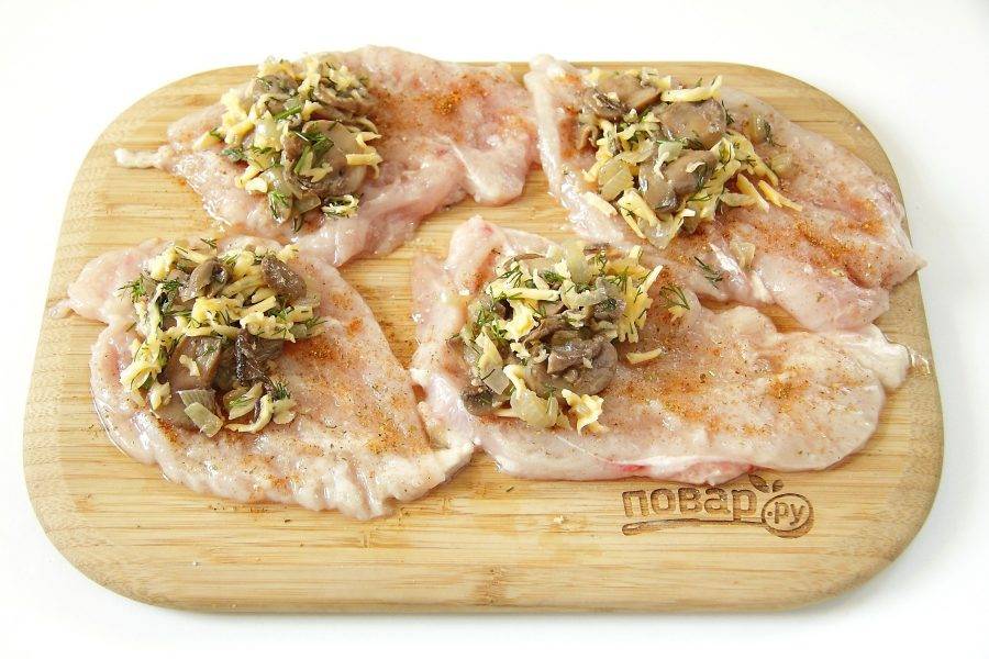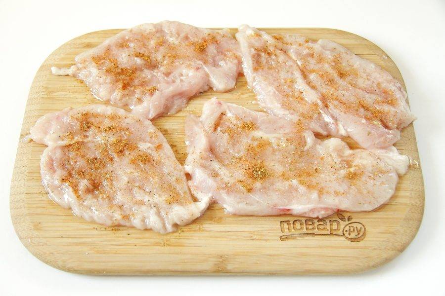 Куриную грудку нарежьте вдоль на порционные кусочки, отбейте молоточком, посолите по вкусу и посыпьте специями.