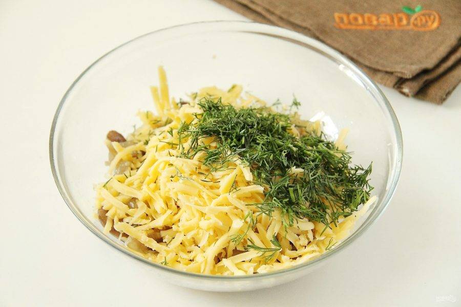 Добавьте тертый сыр и любую свежую зелень. Посолите по вкусу и перемешайте.