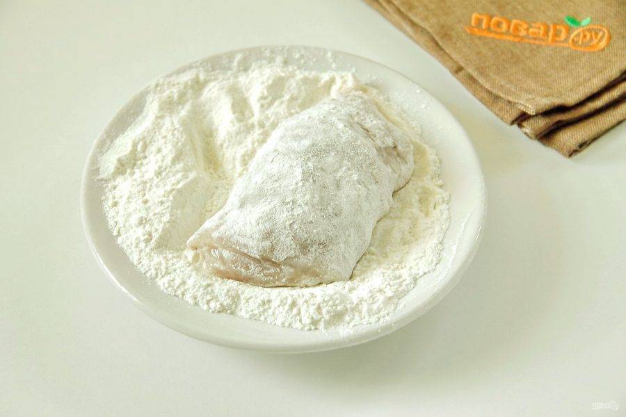 Сверните каждое филе рулетом и обваляйте поочередно сначала в муке.