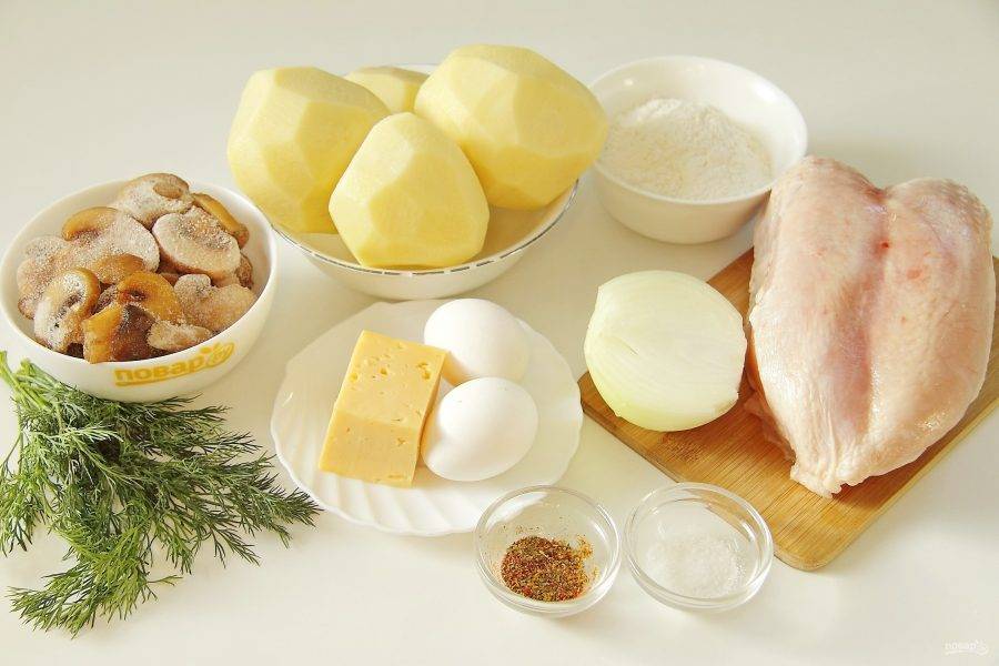 Положите грудку на ладонь и ложкой выложите на нее картофельную массу. Распределите картофель со всех сторон и прижмите руками. Таким образом заверните в "шубку" каждое филе.