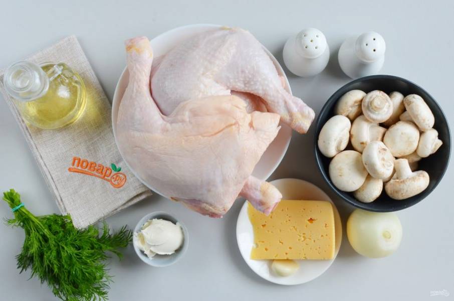 Подготовьте ингредиенты. Вымойте тщательно корочка, удалите жир, хвостики, желтую грубую кожицу на суставах. Очистите лук и чеснок. Вымойте грибы и зелень. Приступим!