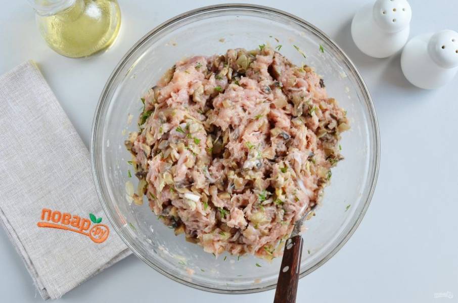 В большой миске соедините куриный фарш с жареными грибами и луком, тертым сыром, измельченным укропом. Посолите, поперчите по вкусу. Добавьте сметану.