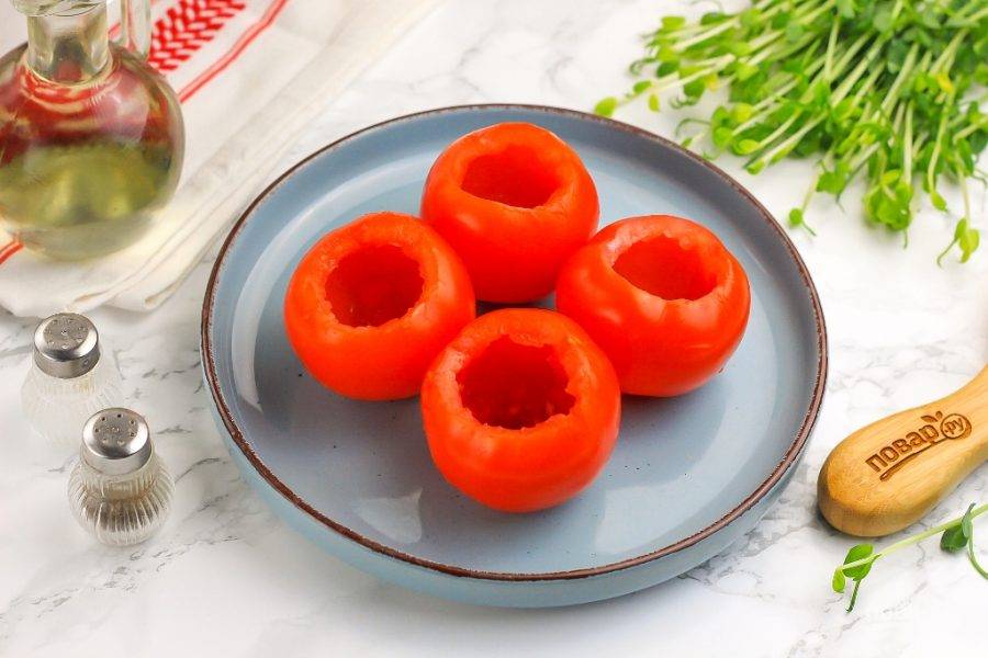 Помидоры промойте в воде, просушите бумажными салфетками и срежьте крышечку с зеленой сердцевинкой. Затем с помощью столовой или чайной ложки извлеките всю мякоть, оставляя лишь "бочонки".
