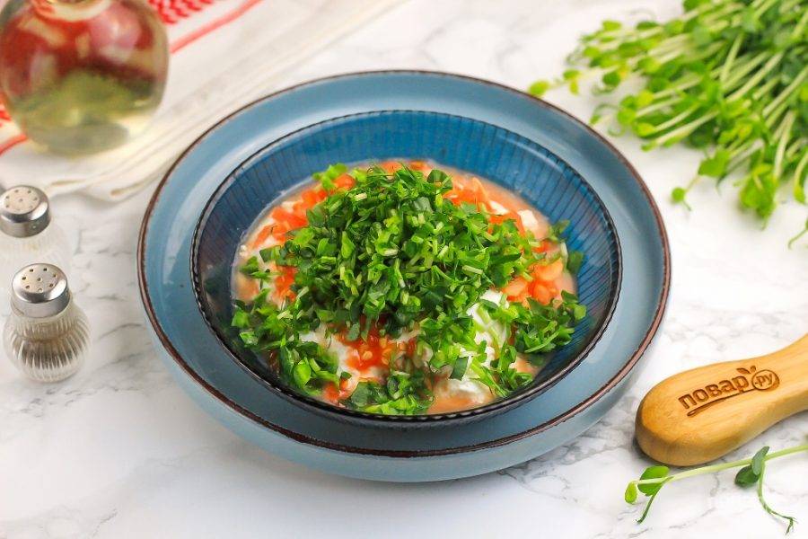 Промойте свежую зелень, стряхните с нее лишнюю влагу и подсушите салфеткой. Мелко-мелко нарежьте и добавьте в емкость к творожному сыру. Тщательно все вымешайте — начинка полностью готова!