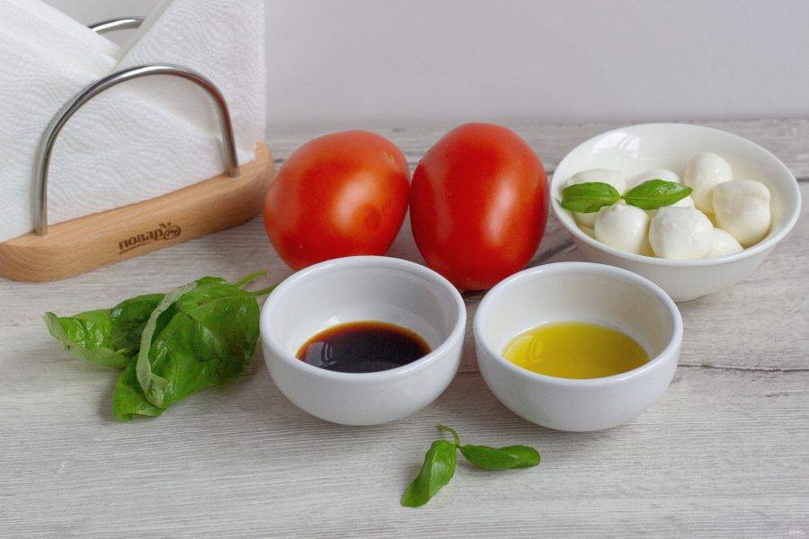 Подготовьте все необходимые ингредиенты. Помидоры и базилик помойте, обсушите.