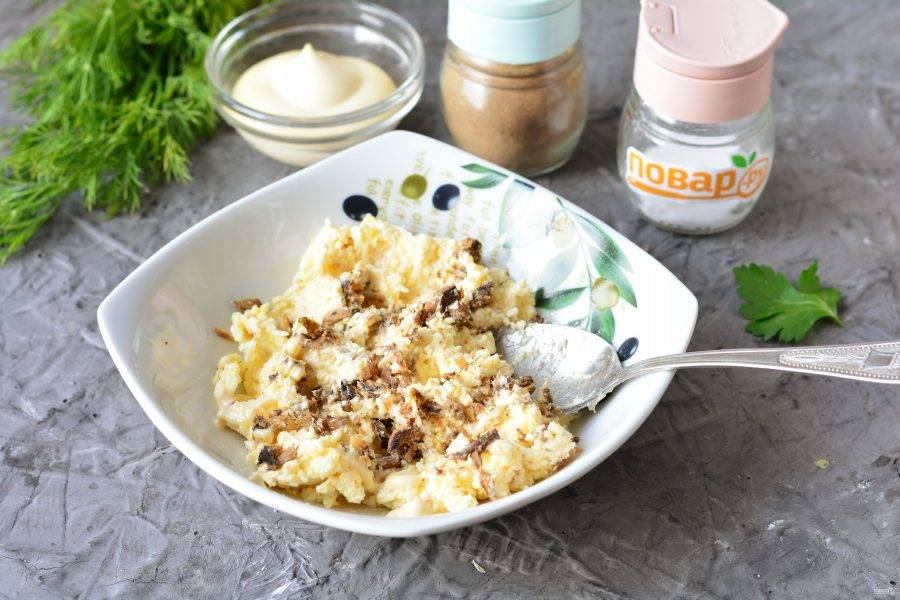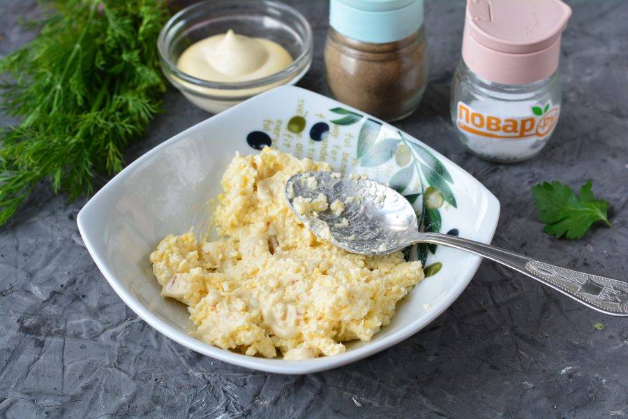 Натрите плавленый сыр на терке и перемешайте с майонезом и специями.