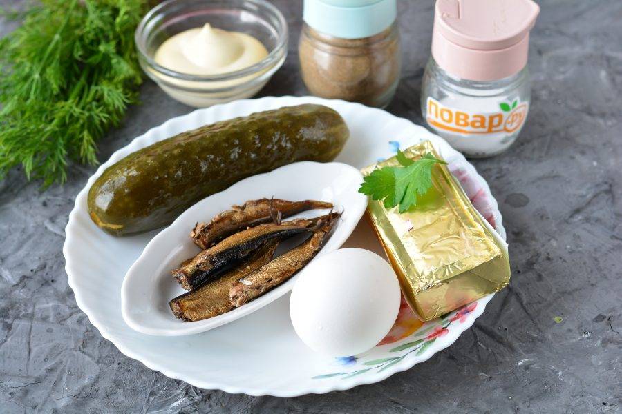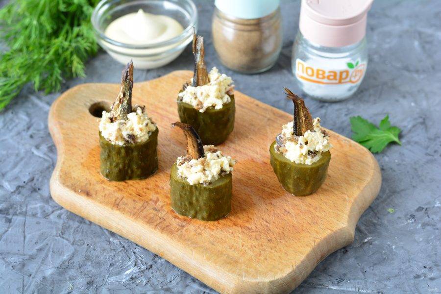 Нафаршируйте огурцы сырно-шпротной начинкой.