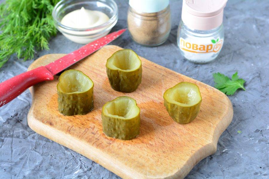Нарежьте соленые огурцы крупными кусочками, чтобы получились своеобразные "пенёчки". Извлеките внутренность из огурцов, аккуратно вырежьте ножом, чтобы осталось дно.