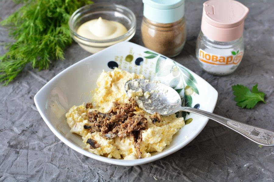 Добавьте измельченные шпроты. А хвостики отложите для декора.