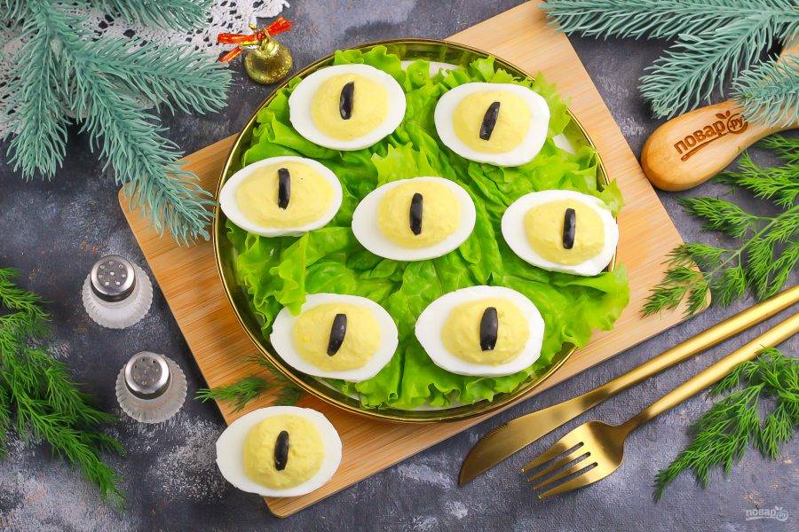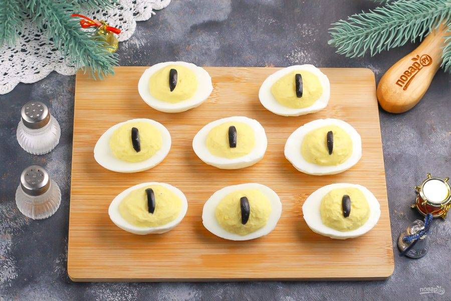 Маслины без косточек разрежьте вертикально на узкие полоски и выложите по одной в центр каждого фаршированного яйца.
