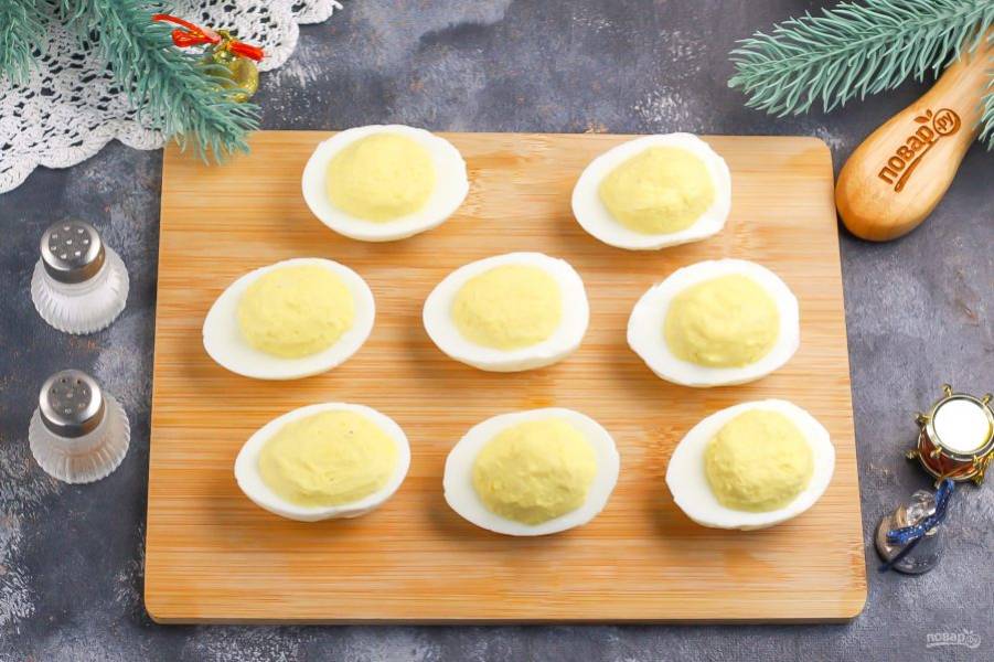 Выложите желтки в пиалу, посолите и тщательно перемешайте с майонезом. Выложите обратно в "лодочки" и смочите руки в воде. Закруглите начинку в фаршированных яйцах.