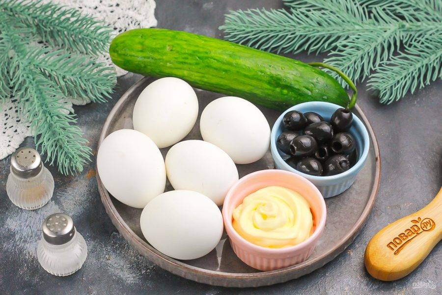 Подготовьте указанные продукты. Куриные яйца отварите заранее в течение 12 минут и остудите в ледяной воде.