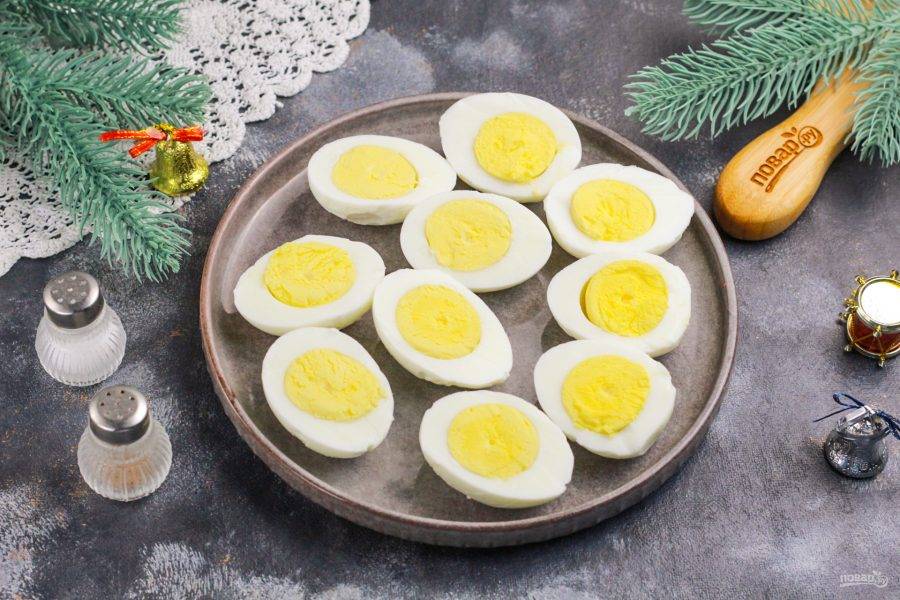 Отварные куриные яйца очистите от скорлупы и промойте в воде. Разрежьте пополам, чтобы получились "лодочки".