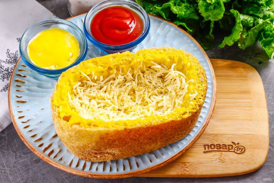 Доверху наполните хлеб натертой сырной массой, чтобы при запекании она расплавилась и запечатала срезанную верхушку блюда.