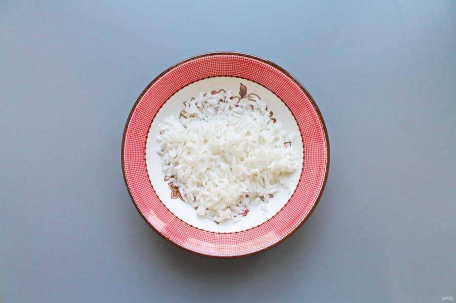 Рис отварите в соленой воде в течение 5 минут и откиньте на сито, дайте отвару полностью стечь.