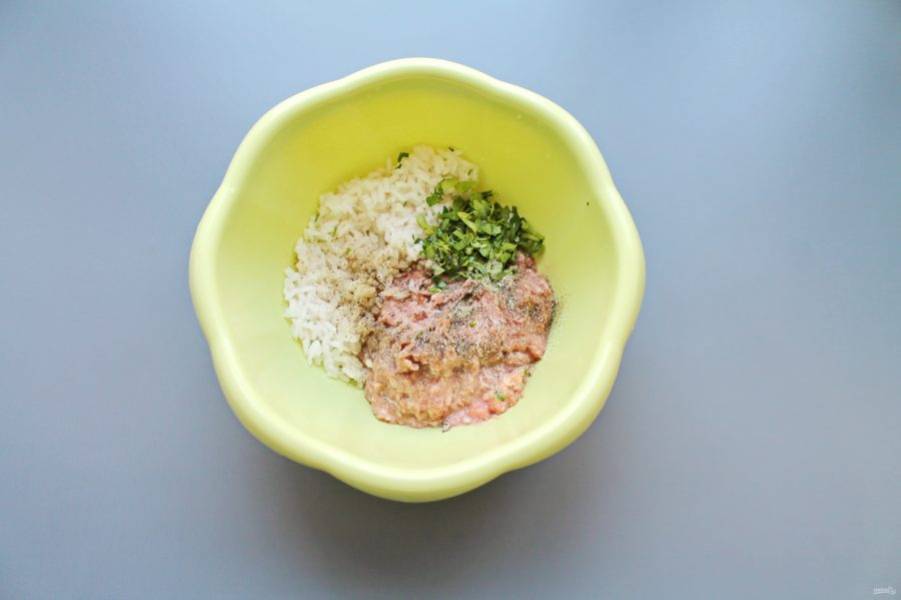 В миску выложите мясной фарш, добавьте отварной рис, нарезанную зелень, посолите, поперчите и хорошо перемешайте. Отбейте фарш до плотного состояния.