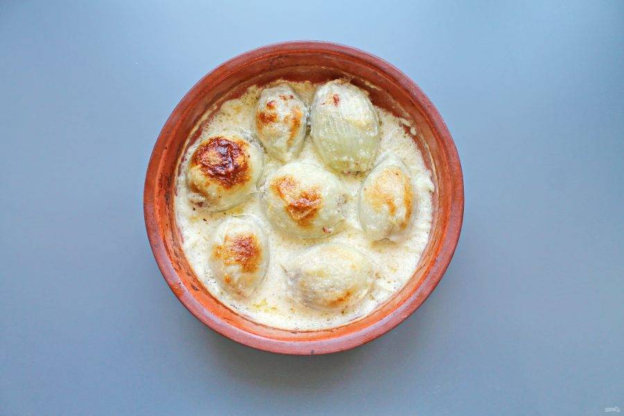 Полейте луковки соусом и запекайте еще 15-20 минут, до готовности. Спустя время достаньте форму из духовки и сразу подавайте блюдо к столу.