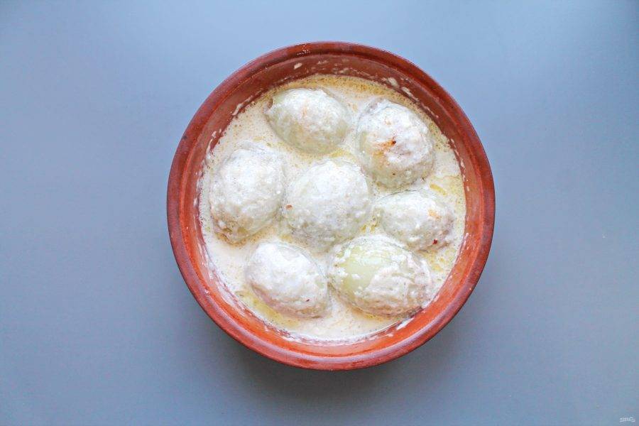Смешайте до однородности воду, майонез, посолите и поперчите. Выложите фаршированный лук и залейте соусом.