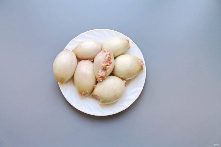 Полученным фаршем нафаршируйте луковые слои, придавая форму целой луковки.