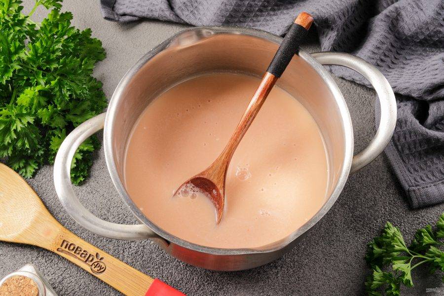 Соедините томатную пасту и сметану. Перемешайте. Тонкой струйкой влейте воду. Добавьте соль и молотый перец по вкусу. Если хотите, чтобы соус получился более густой, можно добавить 1,5 ст.л. муки.