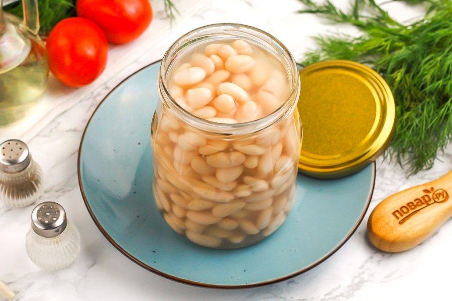 Ошпарьте банку и крышку кипятком, выложите в нее фасоль и залейте жидкостью, в которой она варилась.