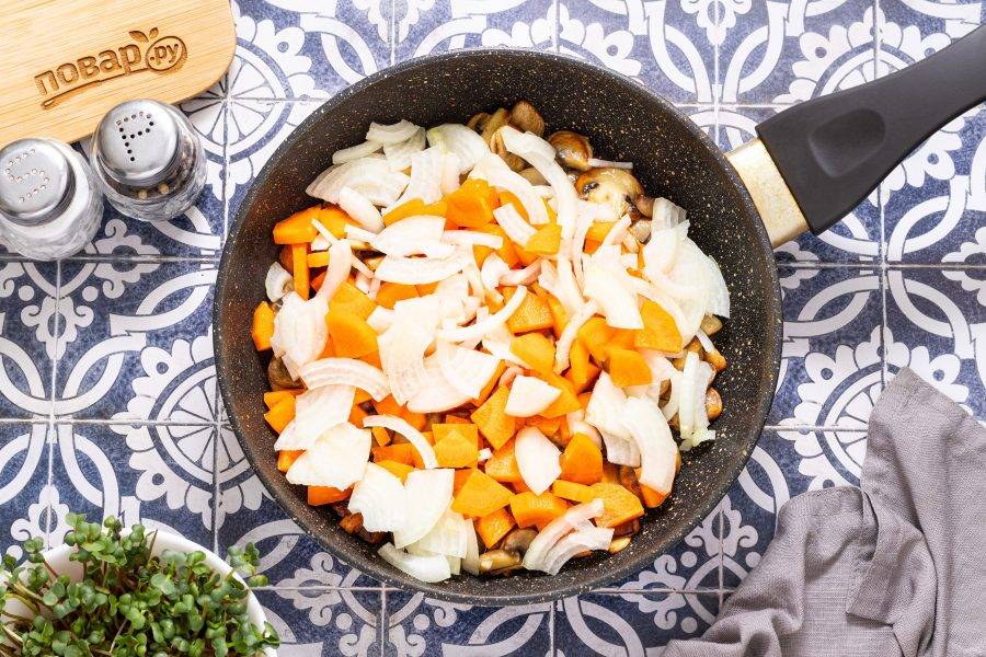 Убавьте температуру, добавьте морковь и репчатый лук. Жарьте все вместе до мягкости и золотистого цвета овощей.