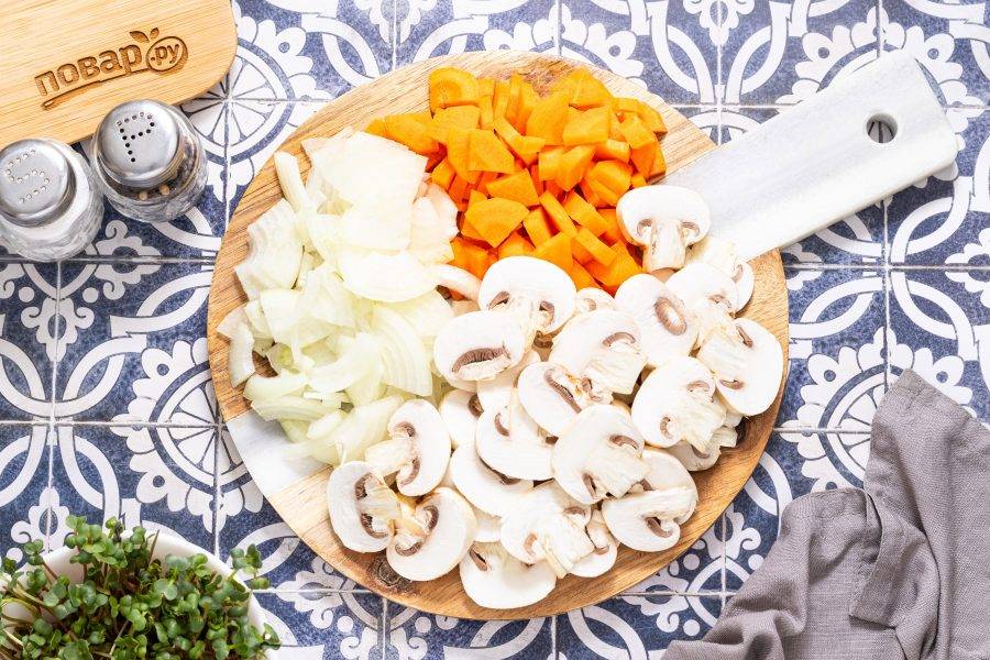 Репчатый лук нарежьте полукольцами, морковь очистите и нарежьте на ломтики средней толщины. Шампиньоны промойте, нарежьте пластинами.