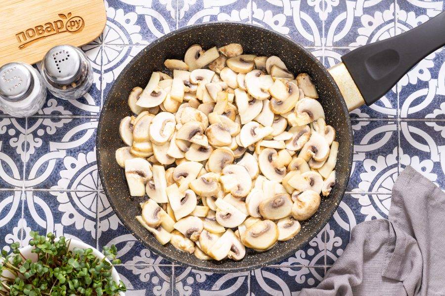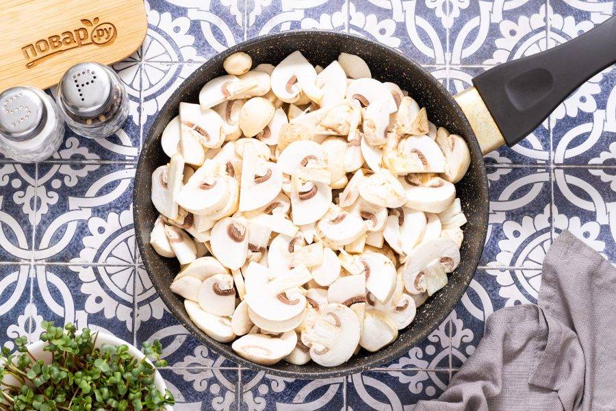 Разогрейте на среднем огне сковороду с растительным маслом. Выложите шампиньоны.