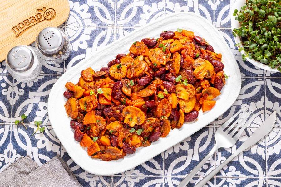 Давайте приготовим тушеную фасоль с шампиньонами. Это простое, но вкусное и сытное блюдо. Фасоль хорошо сочетается с грибами по вкусу. Подавать такое блюдо можно и в качестве закуски, и как гарнир.