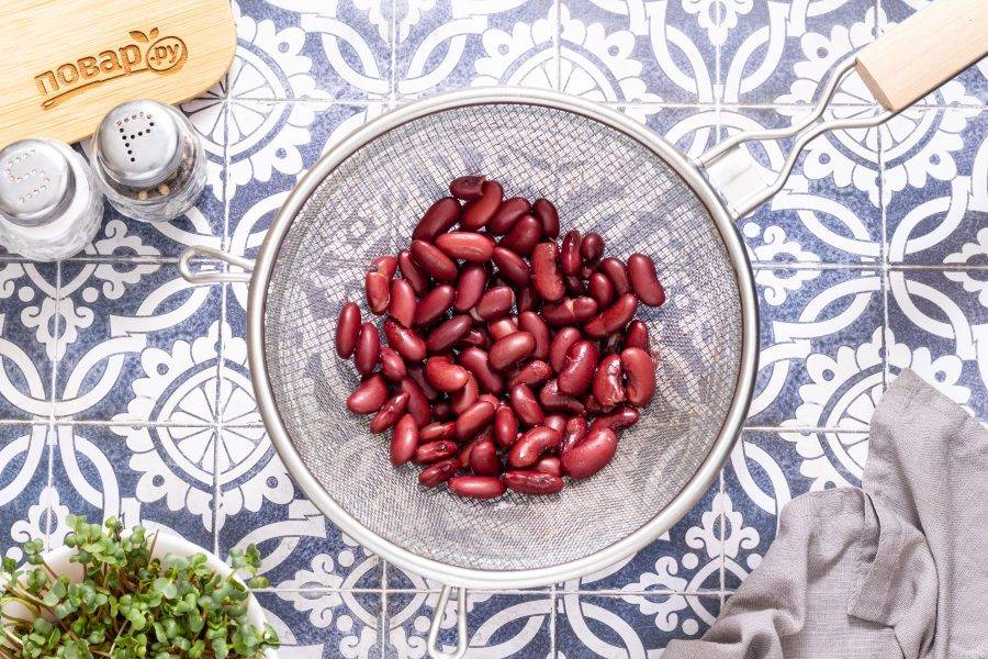 Консервированную фасоль промойте от жидкости, в которой она хранилась. Откиньте на сито, дайте стечь воде.