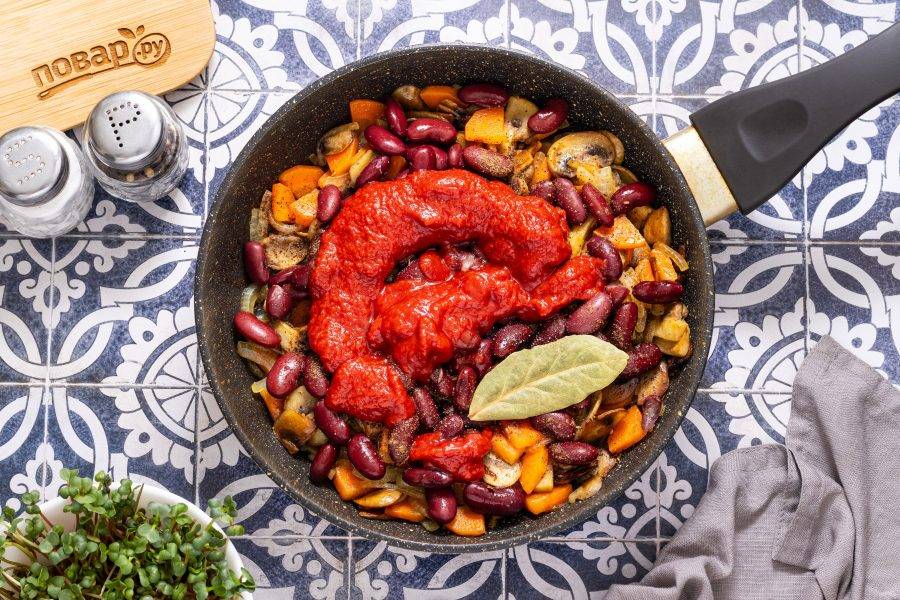 Добавьте томатный соус. Влейте немного (около 100 мл.) воды, все перемешайте.