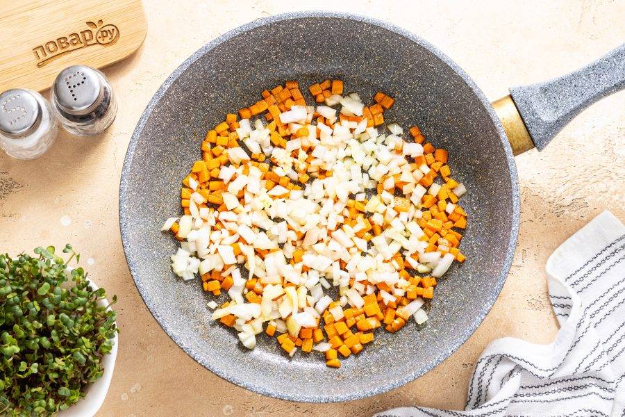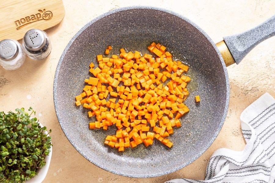 Разогрейте сковороду на среднем огне. Обжарьте с растительным маслом морковь до мягкости и золотистого цвета пару минут.