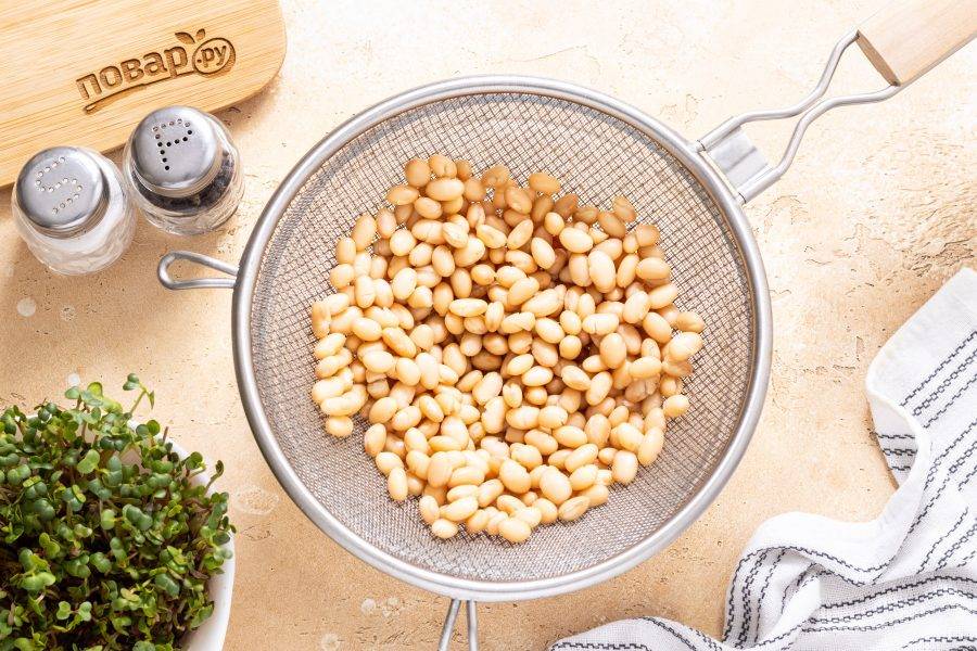 Консервированную фасоль промойте от жидкости, в которой она хранилась, откиньте на сито и дайте стечь лишней жидкости.