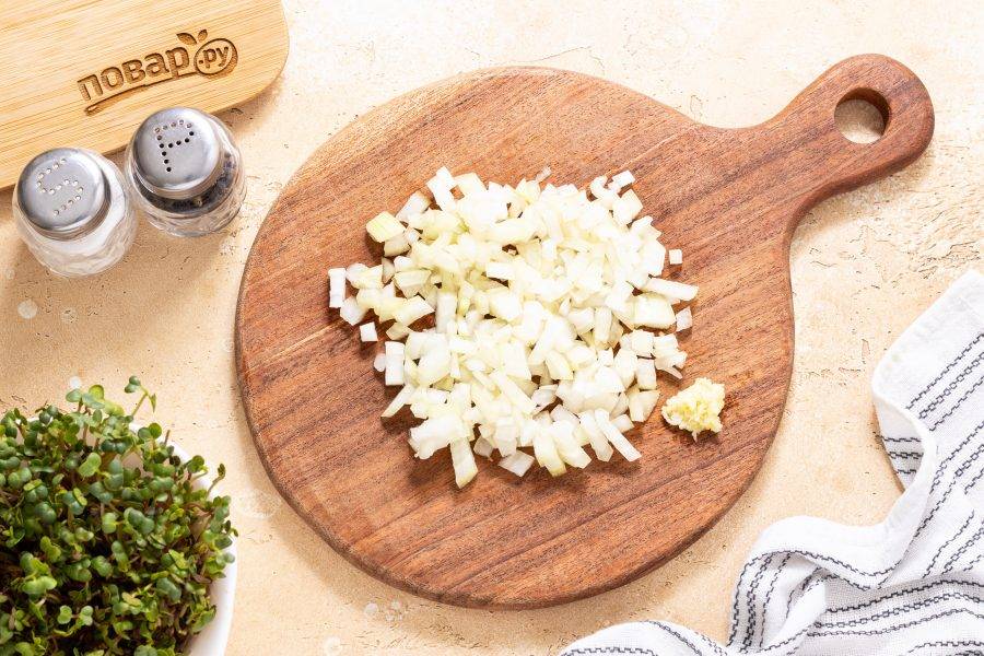 Репчатый лук нарежьте на кубики. Чеснок пропустите через пресс.