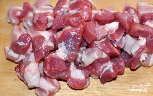 Традиционно замочите фасоль на несколько часов: чем дольше — тем лучше. Мясо нарежьте небольшими кубиками, предварительно его очистив, промыв и обсушив с помощью салфеток.
