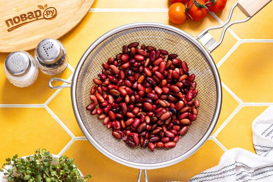 После промойте фасоль, откиньте на сито и дайте стечь лишней воде.