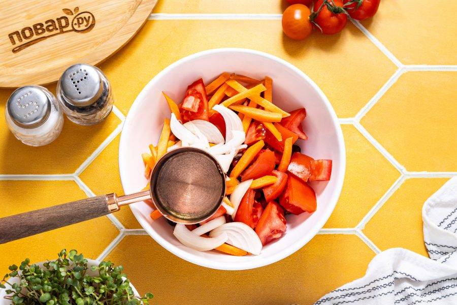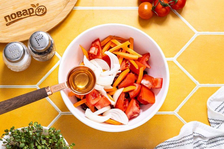 Морковь нарежьте брусочками. Репчатый лук нарежьте полукольцами. Помидоры нарежьте крупными кубиками.