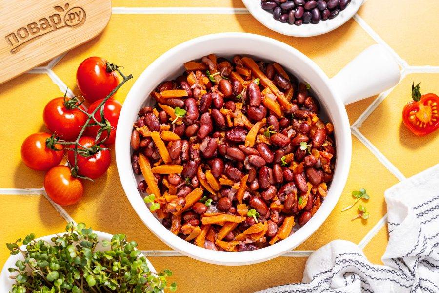 После достаньте фасоль, посолите и поперчите. Готовьте на средней мощности еще 20-25 минут до мягкости фасоли.