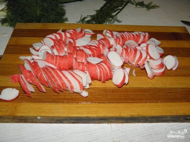 Крабовые палочки вскрыть, нарезать достаточно тонко.