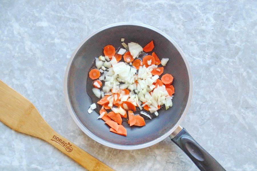 Морковь и лук очистите и промойте. Нарежьте не очень крупно и выложите в сковороду.