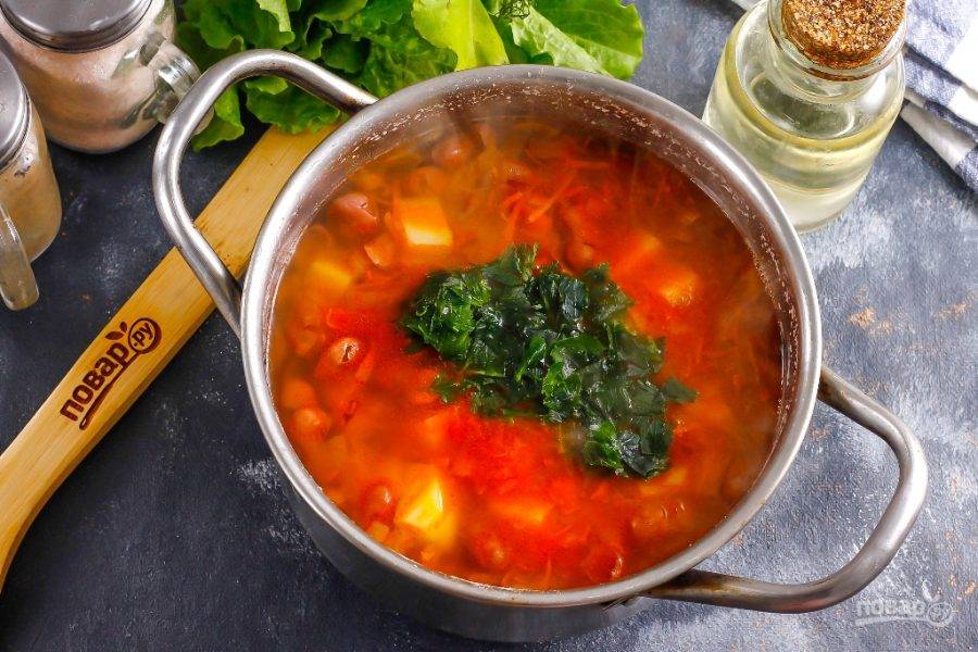 Выложите зажарку с томатной пастой в кастрюлю с отваренными фасолью и картофелем. Отварите еще 5 минут.