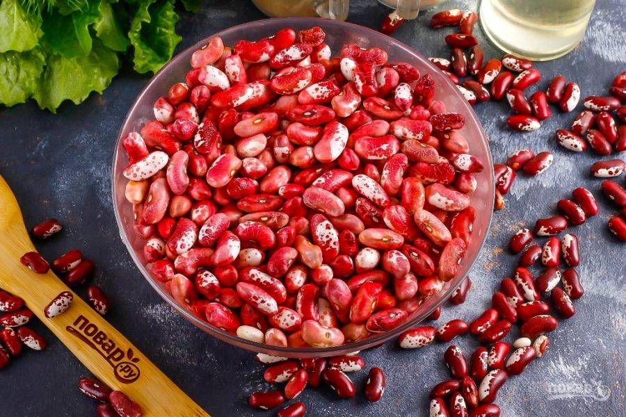 Фасоль промойте в воде, высыпьте в глубокую миску и залейте кипятком или горячей водой. Оставьте минимум на 2 часа, максимум — на ночь при комнатной температуре. За это время бобовые впитают в себя практически всю жидкость. Слейте ее и промойте фасоль еще раз.