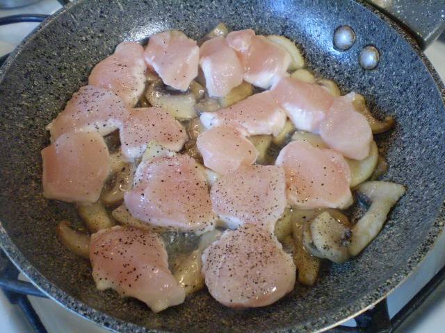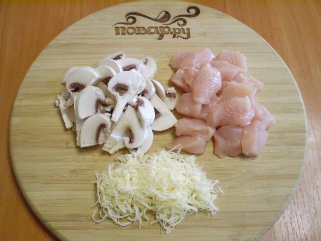 Грибы порежьте пластинками, филе – кубками. Сыр натрите на терке.