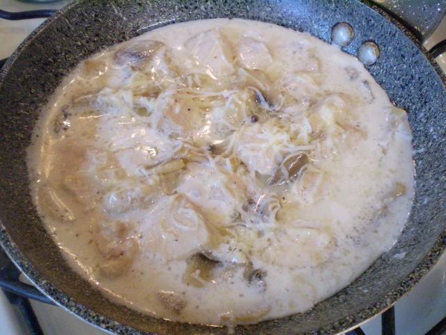 Тертый сыр и сливки смешайте, влейте смесь к мясу с грибами. Тушите до загустения.